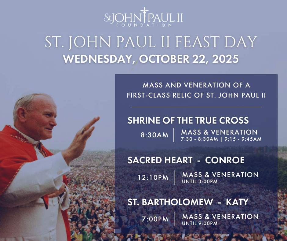 There is no registration for this event. At each parish, attendees will have an opportunity to venerate a first-class relic of St. John Paul II's blood, a gift we received from his personal secretary, Cardinal Stanislaw Dziwisz.